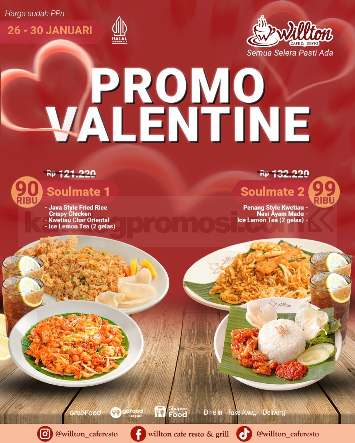 Promo Willton Valentine Paket Makan Berdua Spesial Mulai Rp. 90 ribu paket makan + minum untuk 2 orang berlaku mulai tanggal 9 Februari 2026 – 14 Februari 2026