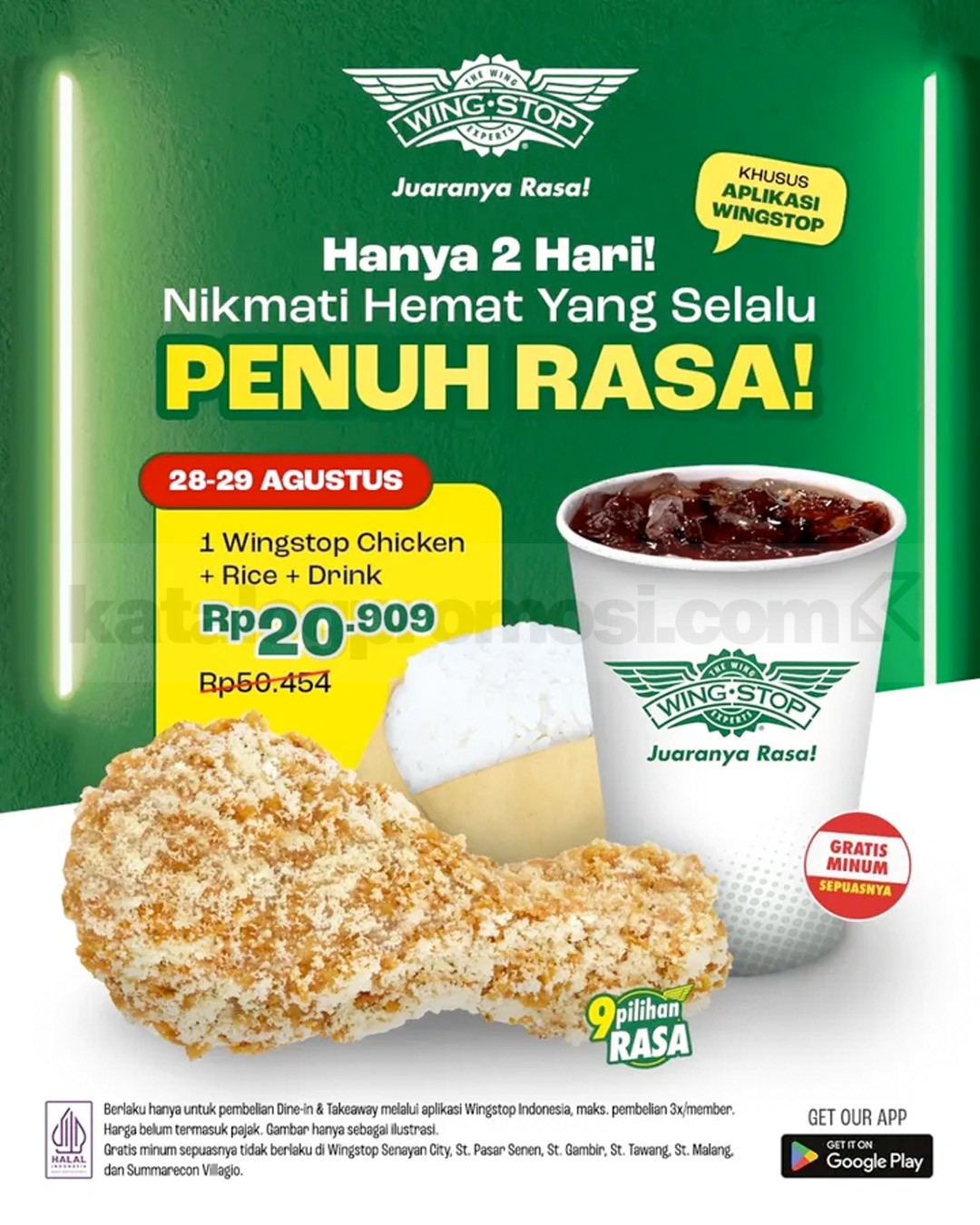 Promo Wingstop khusus aplikasi Rp20 ribuan berlaku 28 – 29 Agustus 2025 untuk paket chicken + rice + drink free refill, dine-in & takeaway via aplikasi.