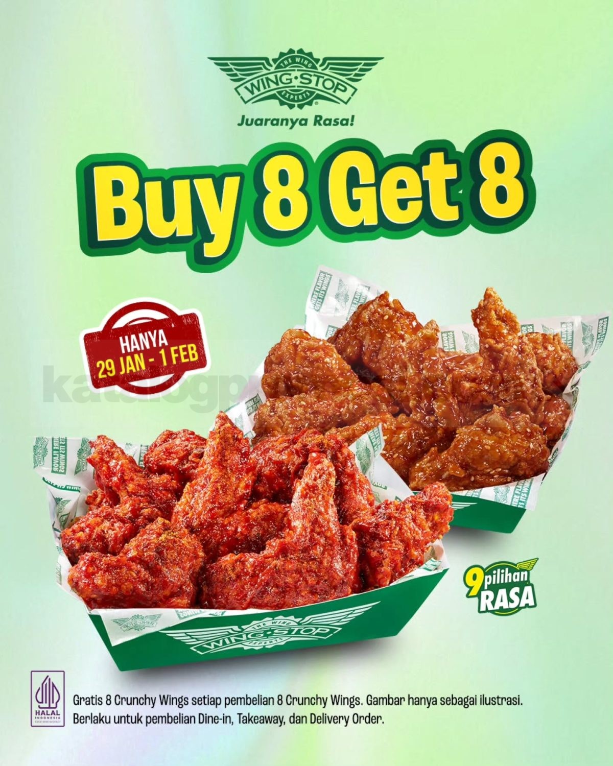 Promo Wingstop Buy 8 Get 8 Crunchy Wings berlaku mulai 29 Januari 2026 sampai 1 Februari 2026.