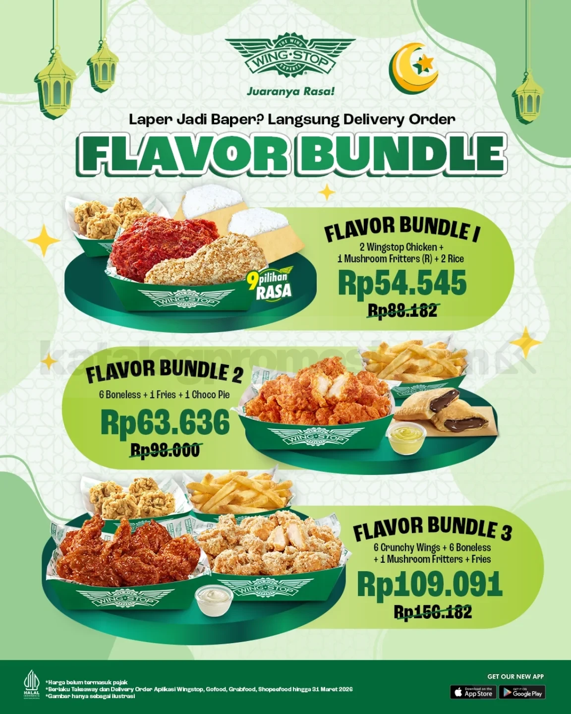 Promo Wingstop Flavor Bundle mulai Rp. 54.545 paket ayam dan side menu lengkap via GoFood, GrabFood, ShopeeFood dan aplikasi Wingstop berlaku hingga 31 Maret 2026.