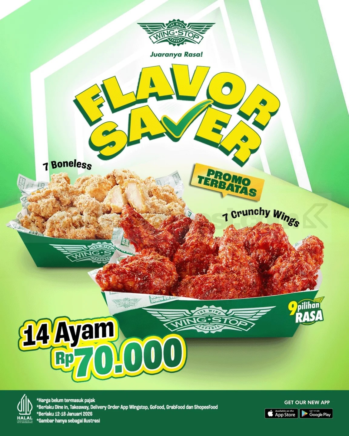 Promo Wingstop Flavor Saver 14 Ayam Rp. 70.000 berlaku 12 – 18 Januari 2026, isi 7 Boneless dan 7 Crunchy Wings untuk dine in, takeaway, dan delivery.