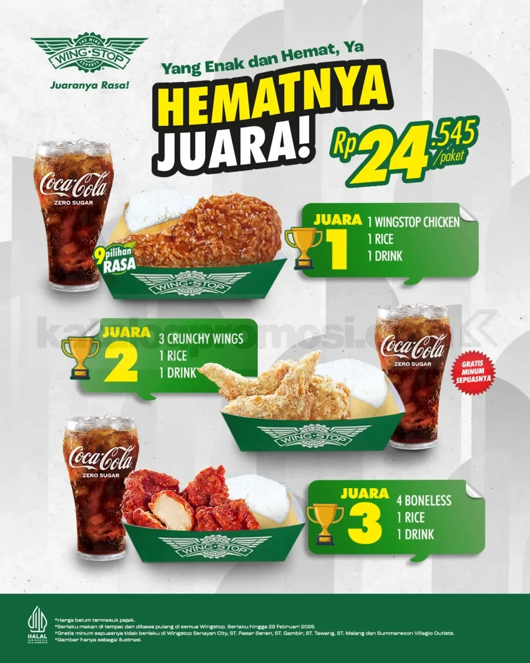 Promo Wingstop Hematnya Juara mulai Rp. 24.545 dengan paket praktis dan gratis minum sepuasnya, berlaku 1–28 Februari 2026 di seluruh outlet tertentu.