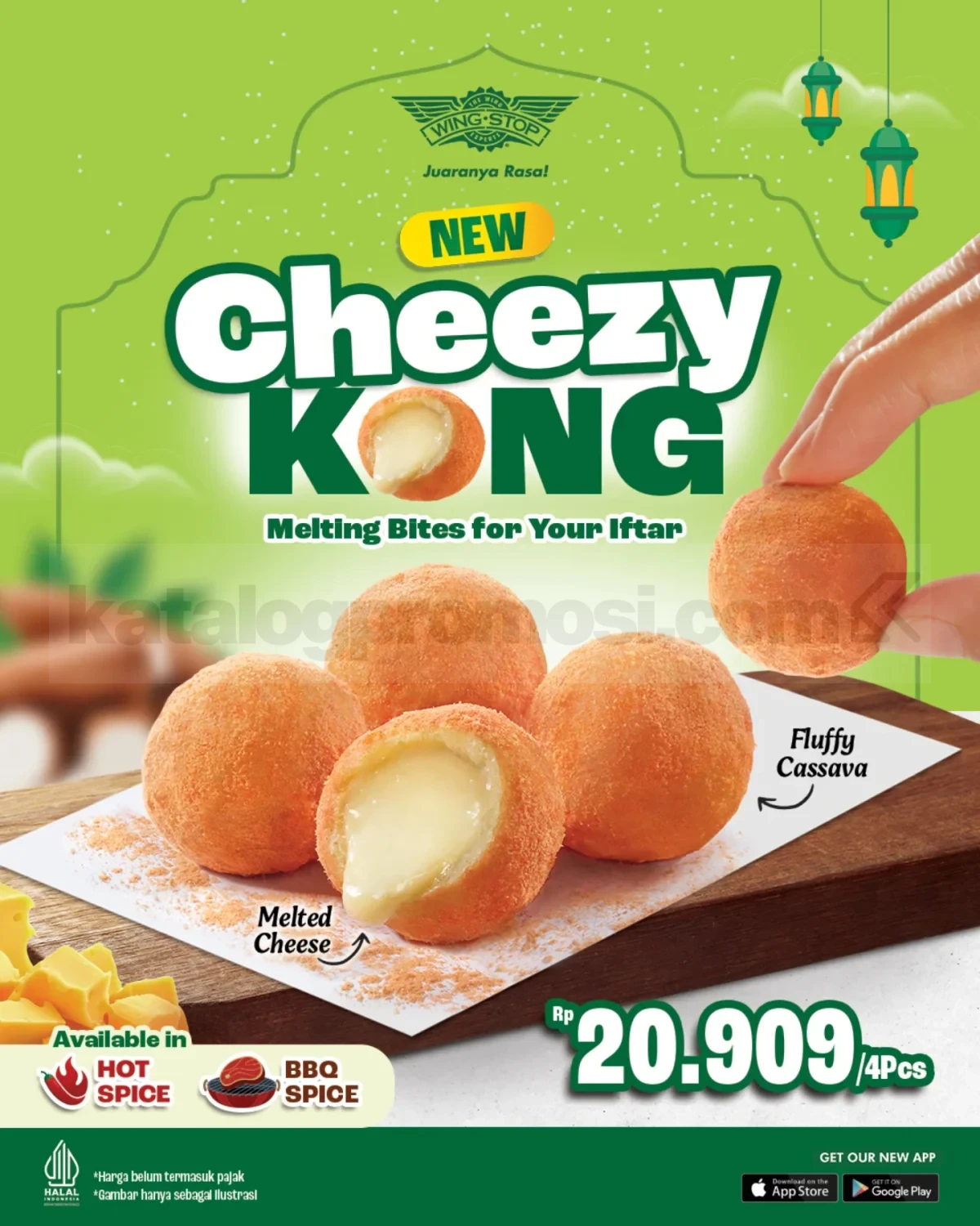 Promo Wingstop NEW Cheezy Kong Rp. 20.909 jadi tambahan takjil yang beda dari biasanya. Satu porsi isi 4 pcs, tekstur singkong lembut di dalam dan renyah di luar, lalu bagian tengahnya lumer saat digigit. Harga tercantum sebelum pajak.