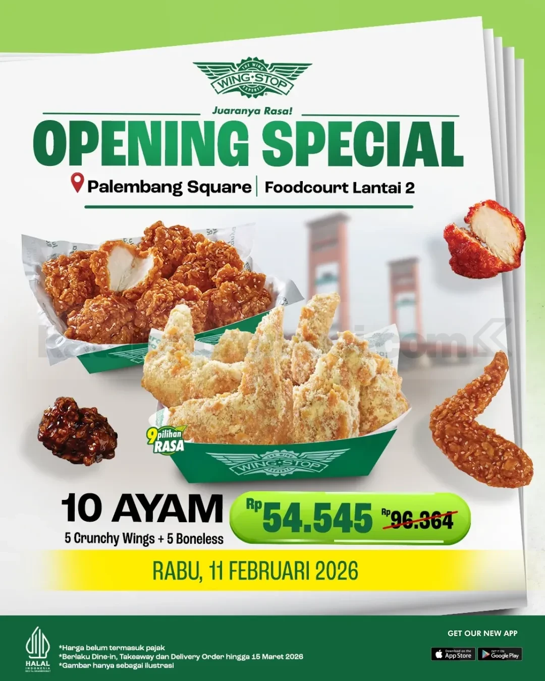 Promo Wingstop Opening Palembang Square 10 Ayam Rp. 54.545 nikmati 5 Crunchy Wings + 5 Boneless dine-in takeaway delivery berlaku 11 Februari 2026 – 15 Maret 2026