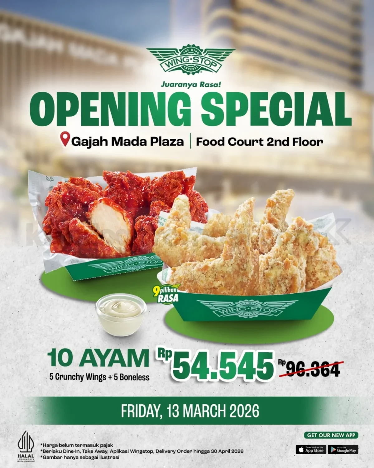 Promo Wingstop Opening Special 10 Ayam Goreng Rp. 54.545 paket 5 Crunchy Wings + 5 Boneless untuk dine-in, takeaway, dan delivery berlaku mulai tanggal 13-30 April 2026 di Gajah Mada Plaza.