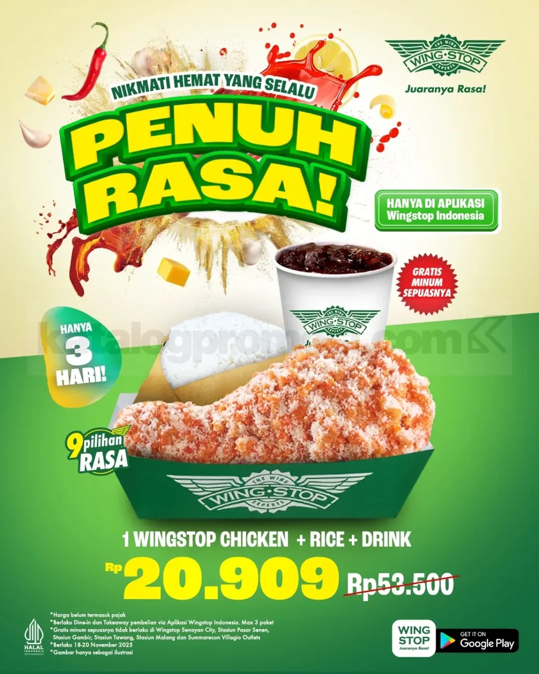 Promo Wingstop Paket Penuh Rasa Rp. 20.909 dengan 1 Chicken, nasi, dan free refill minum via aplikasi berlaku 18 – 20 November 2025 di seluruh outlet.