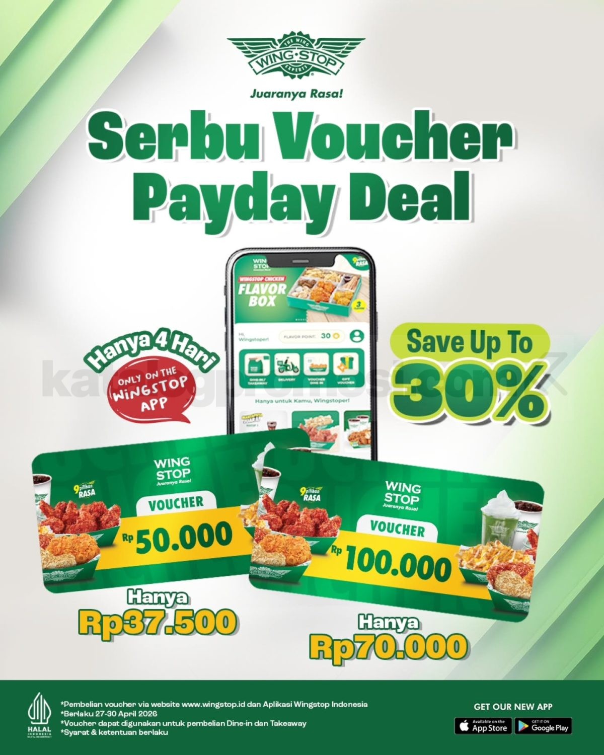 Selama periode 27–30 April 2026, kamu bisa dapetin voucher dengan potongan harga menarik yang bisa digunakan untuk dine-in maupun takeaway. Jadi fleksibel banget, mau makan di tempat atau bawa pulang tetap hemat!