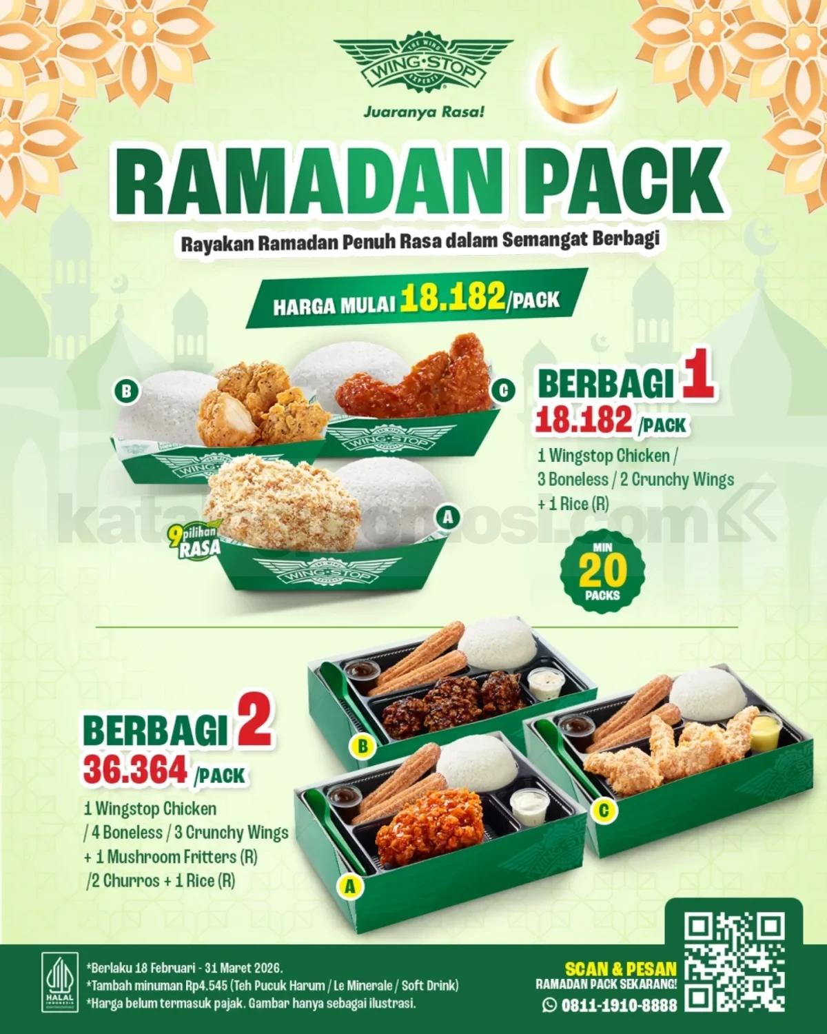 Promo Wingstop Ramadan Pack mulai Rp. 18.182 per pack minimal pesan 20 paket berlaku hingga 31 Maret 2026 melalui pemesanan khusus