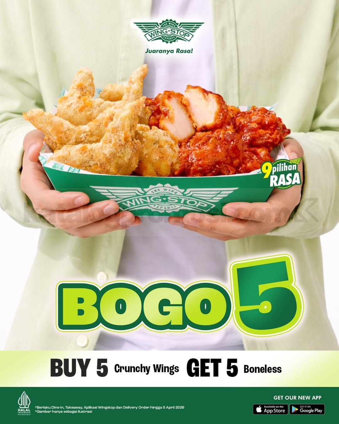 Promo Wingstop Spesial Beli 5 Gratis 5 beli 5 crunchy wings gratis 5 boneless mix 2 rasa berlaku mulai tanggal 30 Maret 2026 – 5 April 2026 di seluruh outlet