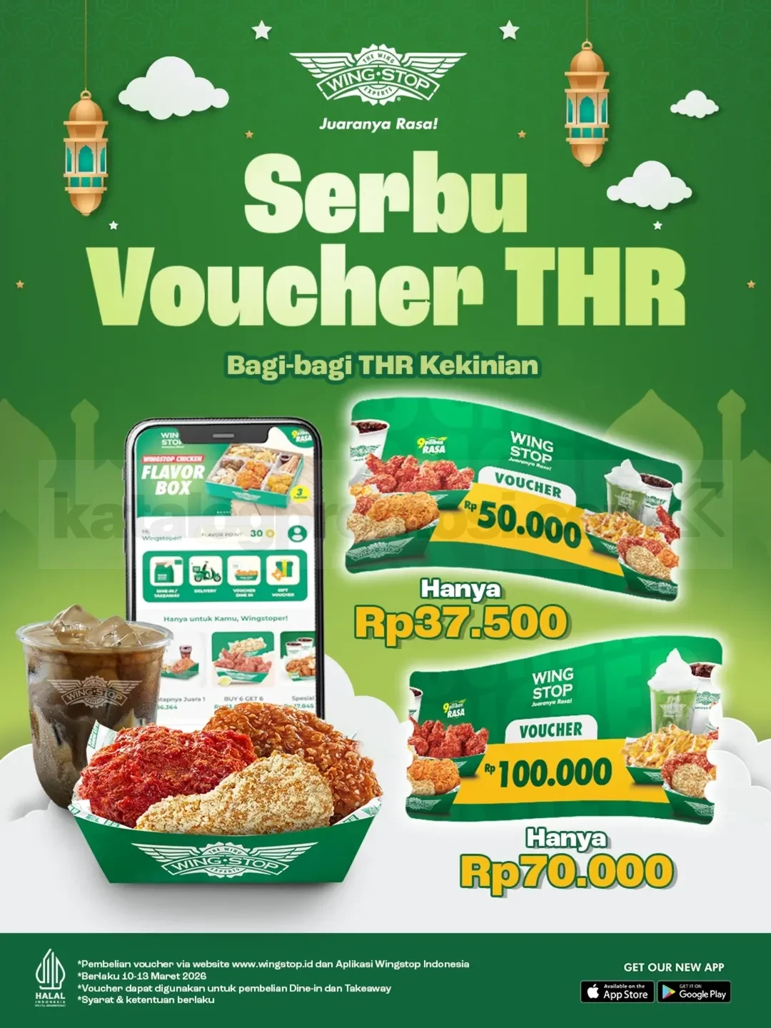Promo Wingstop Voucher THR mulai Rp. 37.500 untuk voucher Rp. 50.000 dan Rp. 100.000, pembelian via website atau aplikasi berlaku 10 Maret 2026 – 13 Maret 2026
