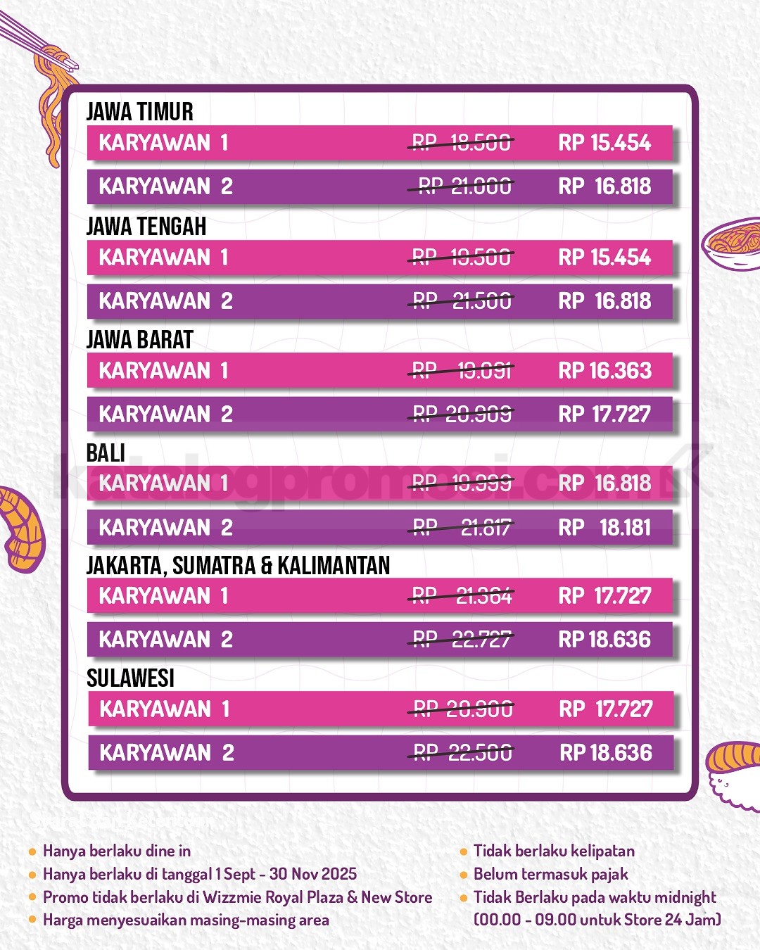 Promo Wizzmie Employee Deals Paket Karyawan mulai dari Rp15ribuan, nikmati paket hemat habis kerja dengan harga berbeda tiap wilayah, berlaku 1 Sep – 30 Nov 2025