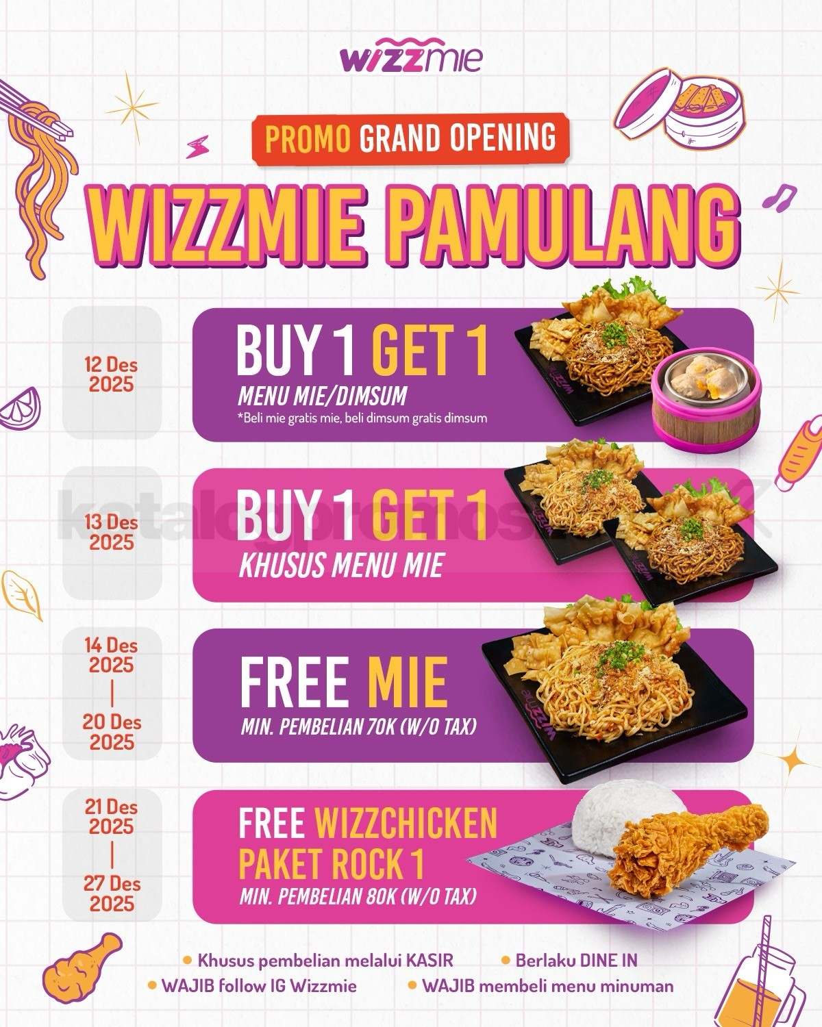 Promo Wizzmie Grand Opening Pamulang Buy 1 Get 1 berlaku mulai 12 Desember 2025. Dapatkan menu mie dan dimsum lebih hemat saat pembukaan outlet baru.