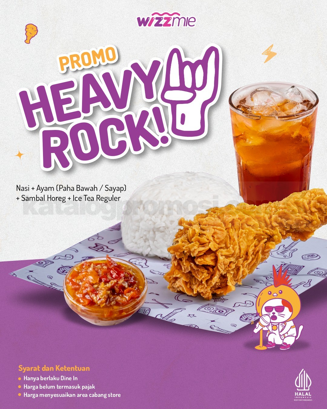 Promo Wizzmie Heavy Rock Paket Nasi Ayam mulai Rp. 17.727 dengan nasi, ayam, sambal horeg dan es teh reguler berlaku selama persediaan masih ada di seluruh outlet