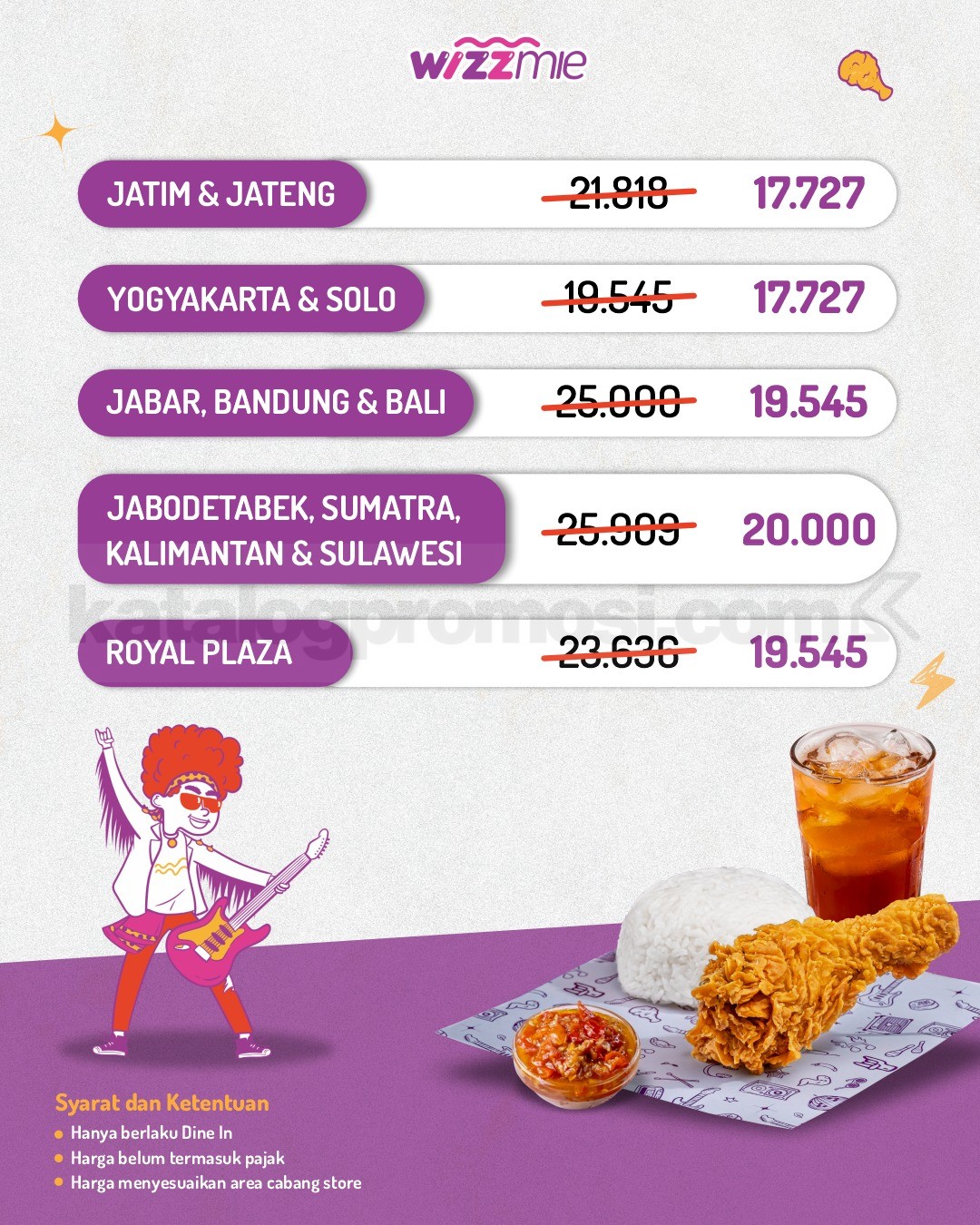 Promo berlaku di seluruh outlet Wizzmie dengan cakupan wilayah Jatim, Jateng, Yogyakarta, Solo, Jabar, Bandung, Bali, Jabodetabek, Sumatra, Kalimantan, Sulawesi, serta Royal Plaza sesuai harga yang ditentukan per area.