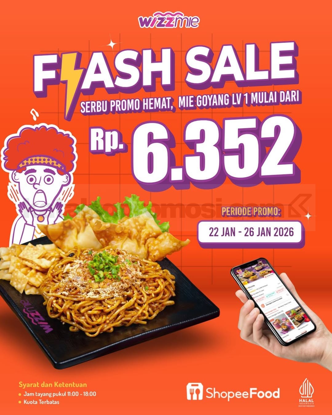 Promo Flash Sale Wizzmie ini berlangsung dalam waktu terbatas, setiap hari di jam tertentu. Jadi kalau kamu lagi cari makan siang hemat atau sore pengin ngemil mie hangat, promo ini jelas layak masuk wishlist. Harga spesial Rp. 6.352 berlaku untuk menu Mie Goyang Level 1 dan bisa langsung dipesan via ShopeeFood selama periode promo berlangsung.