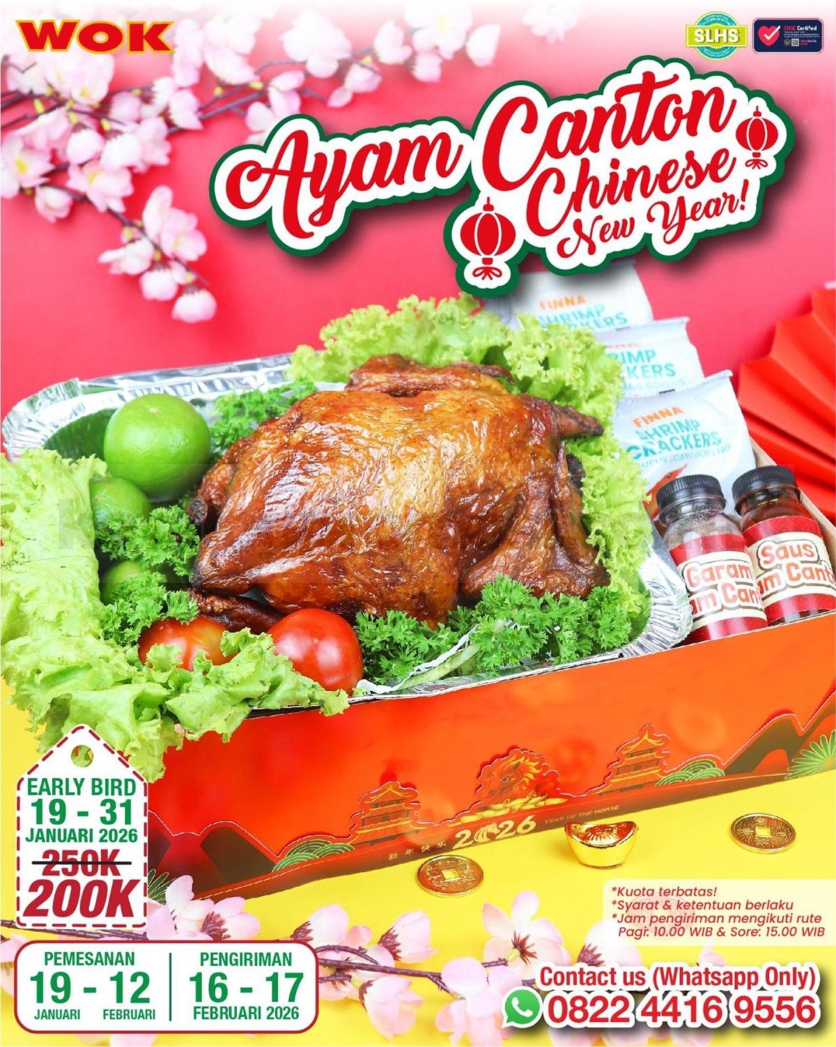 Promo WOK Ayam Canton Chinese New Year mulai Rp. 200.000 dengan paket ayam utuh khas Canton untuk momen Imlek, berlaku mulai tanggal 19 Januari 2026 – 12 Februari 2026.