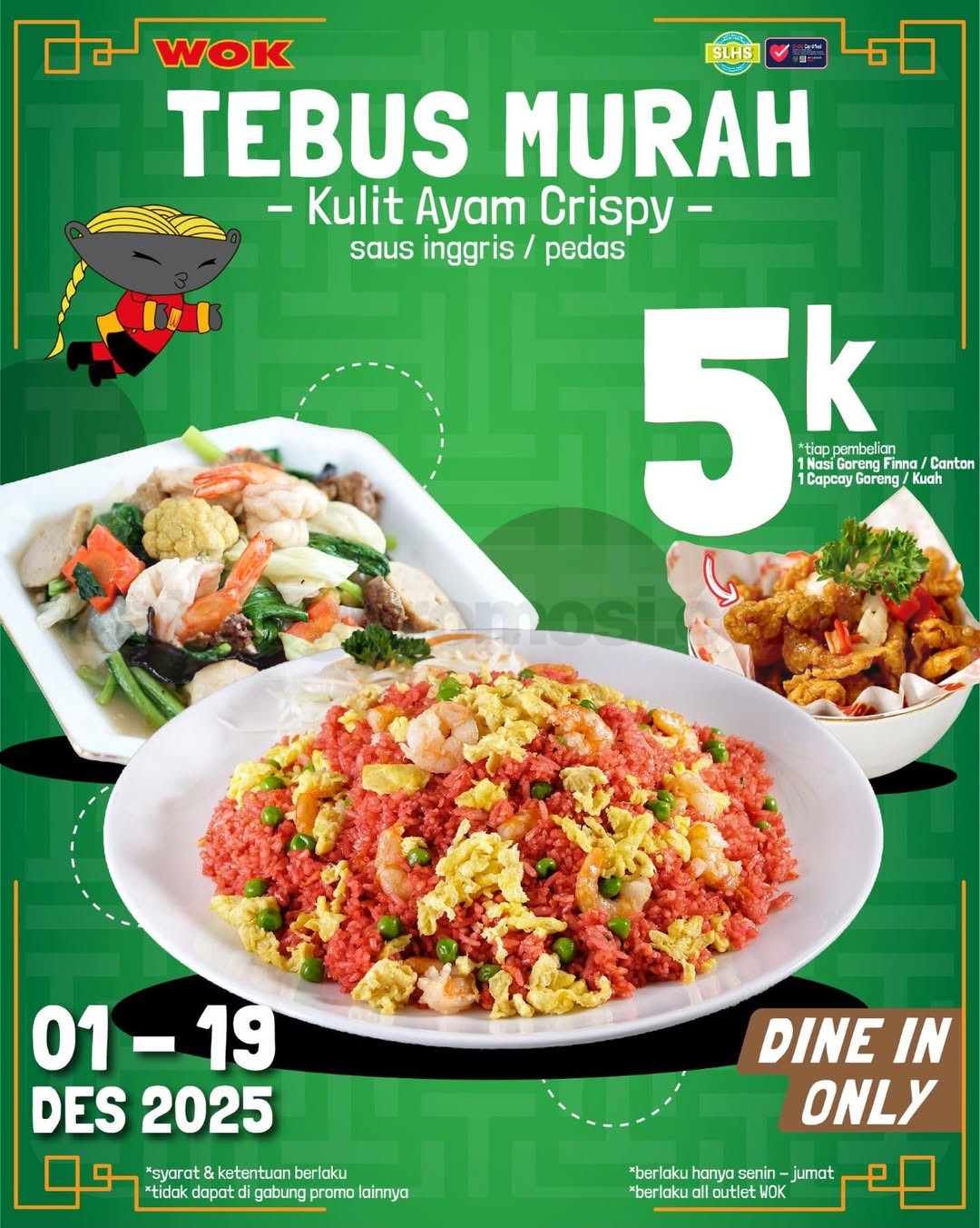 Promo WOK Tebus Murah Kulit Ayam Crispy cuma Rp. 5.000, beli Nasi Goreng + Capcay, berlaku Dine In Senin-Jumat, semua outlet, periode 01-19 Desember 2025.
