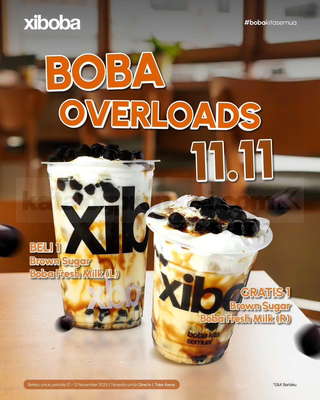 Promo Xiboba Boba Overloads 11.11 Beli 1 Gratis 1 untuk Brown Sugar Boba Fresh Milk Large, berlaku 10–12 November 2025 di seluruh outlet.