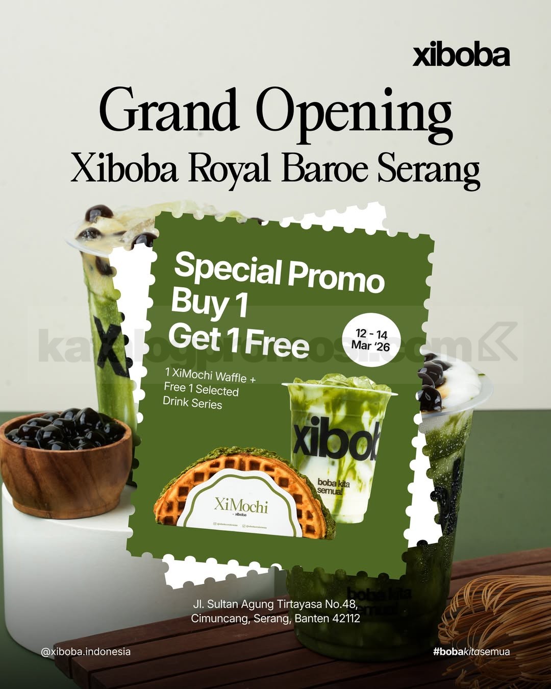 Promo Xiboba Grand Opening Royal Baroe Serang Buy 1 Get 1 setiap beli XiMochi Waffle gratis Brown Sugar Boba Fresh Milk atau Matcha Series berlaku 12 Maret 2026 – 14 Maret 2026