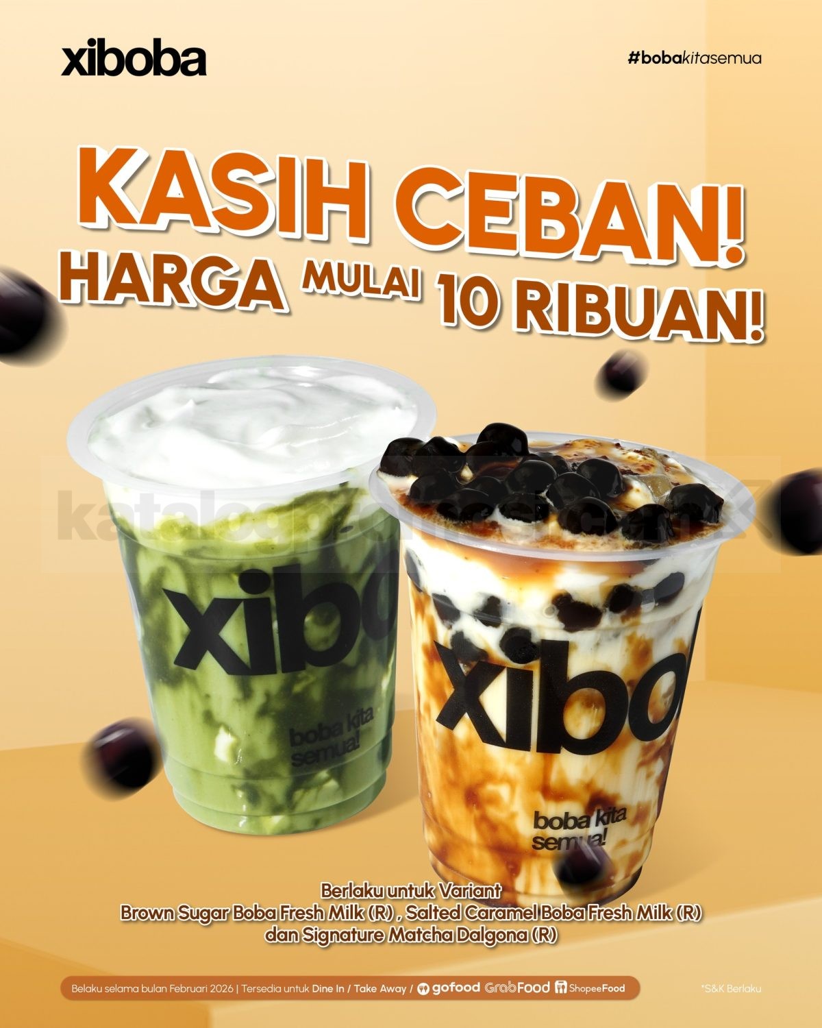 Promo Xiboba Kasih Ceban Minuman Favorit mulai Rp. 10.000 untuk dine in, take away, dan ojol berlaku selama bulan Februari 2026 di seluruh outlet.