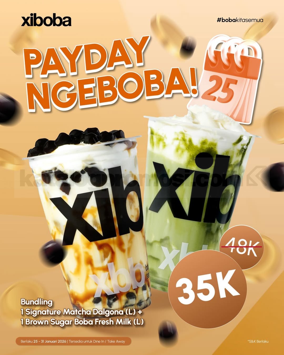 Promo Xiboba Payday Bundling Minuman cuma Rp. 35.000 nikmati dua minuman favorit dalam satu paket berlaku mulai tanggal 25 Januari 2026 – 31 Januari 2026 di seluruh outlet