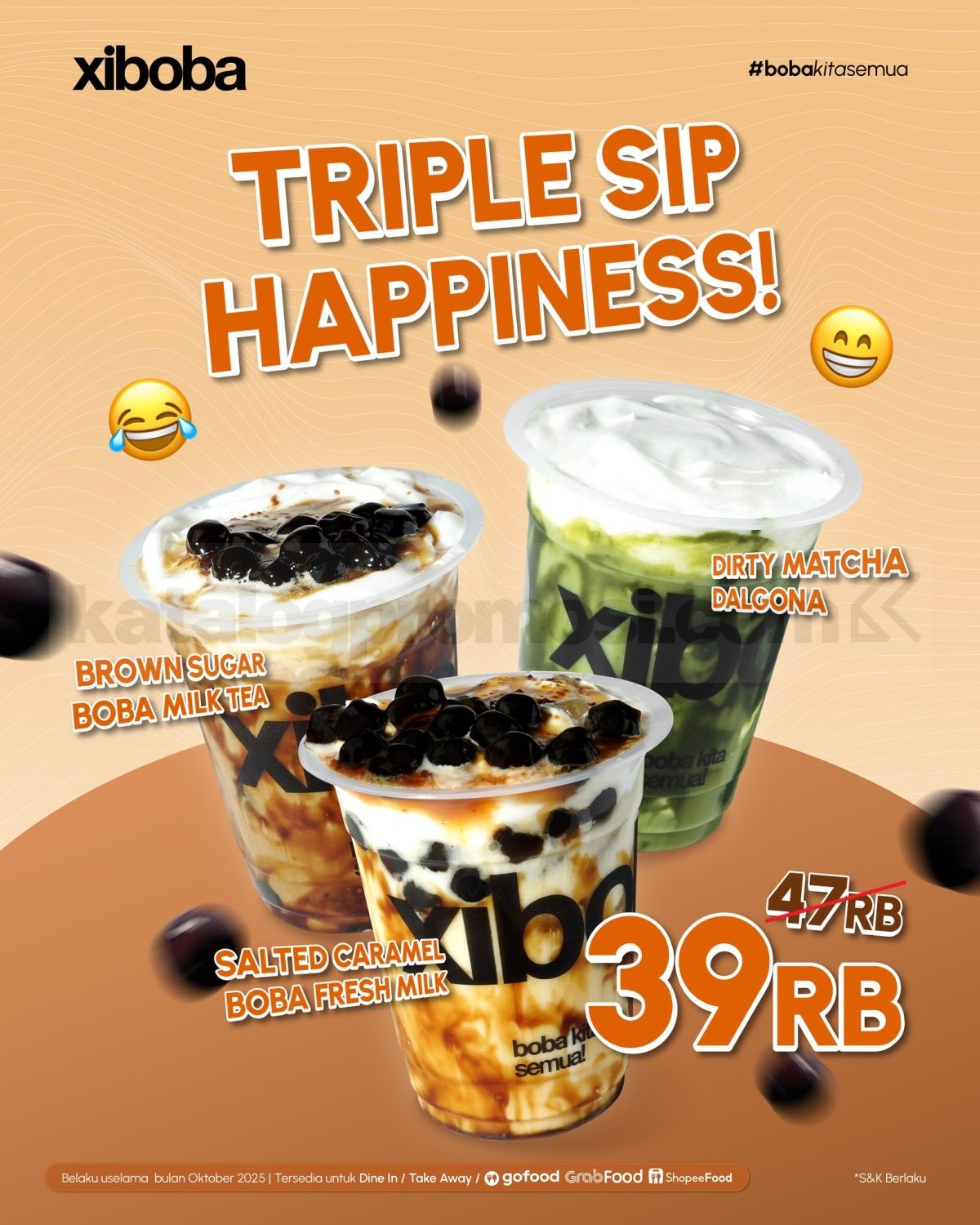 Promo Xiboba Triple Sip Happiness! hanya Rp 39K Berlaku selama bulan Oktober 2025 untuk pembelian dine-in, take away dan delivery online favoritmu.