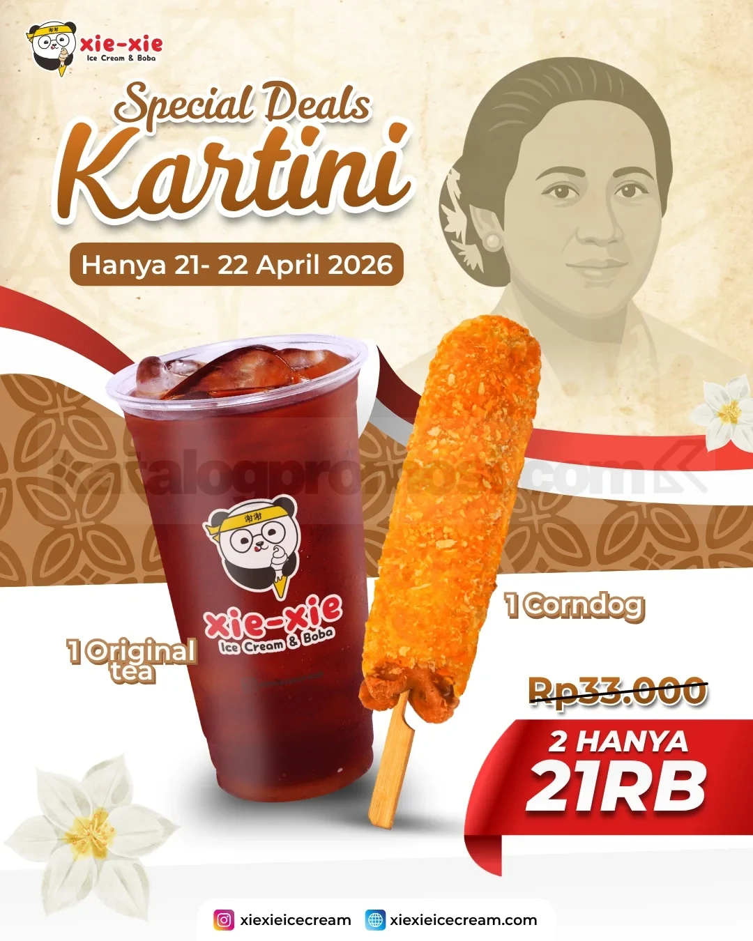 Promo Xie Xie Spesial Hari Kartini Deals 2 Item Rp. 21.000 periode 21 – 22 April 2026 paket 1 Original Tea dan 1 Corndog tersedia di outlet Xie Xie selama program berlangsung.