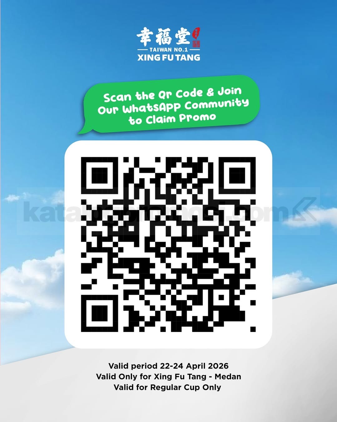 Promo ini berlaku khusus untuk ukuran regular cup, jadi kamu tetap bisa menikmati porsi yang pas tanpa harus upgrade ukuran. Tapi ingat, promo ini eksklusif untuk member WhatsApp Community dan hanya tersedia di outlet tertentu, yaitu di Xing Fu Tang Medan.
