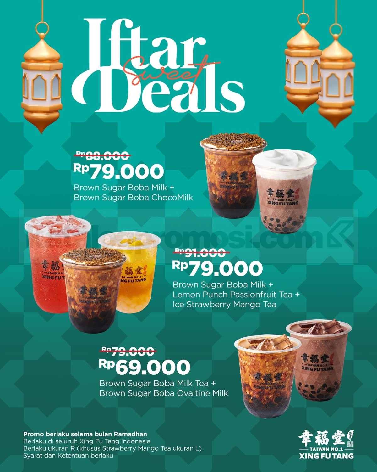 Promo Xing Fu Tang Iftar Sweet Deals mulai Rp. 69.000 ini bikin momen buka puasa jadi lebih manis karena kamu bisa menikmati kombinasi minuman favorit dalam satu paket hemat selama bulan Ramadhan.