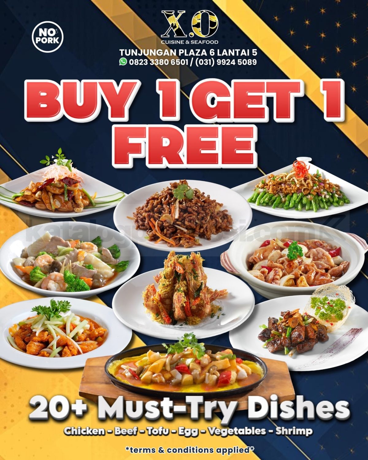 Promo XO Restaurant Buy 1 Get 1 Menu Favorit dengan 20+ pilihan menu chicken, beef hingga seafood, berlaku 28 April 2026 di Tunjungan Plaza Surabaya.