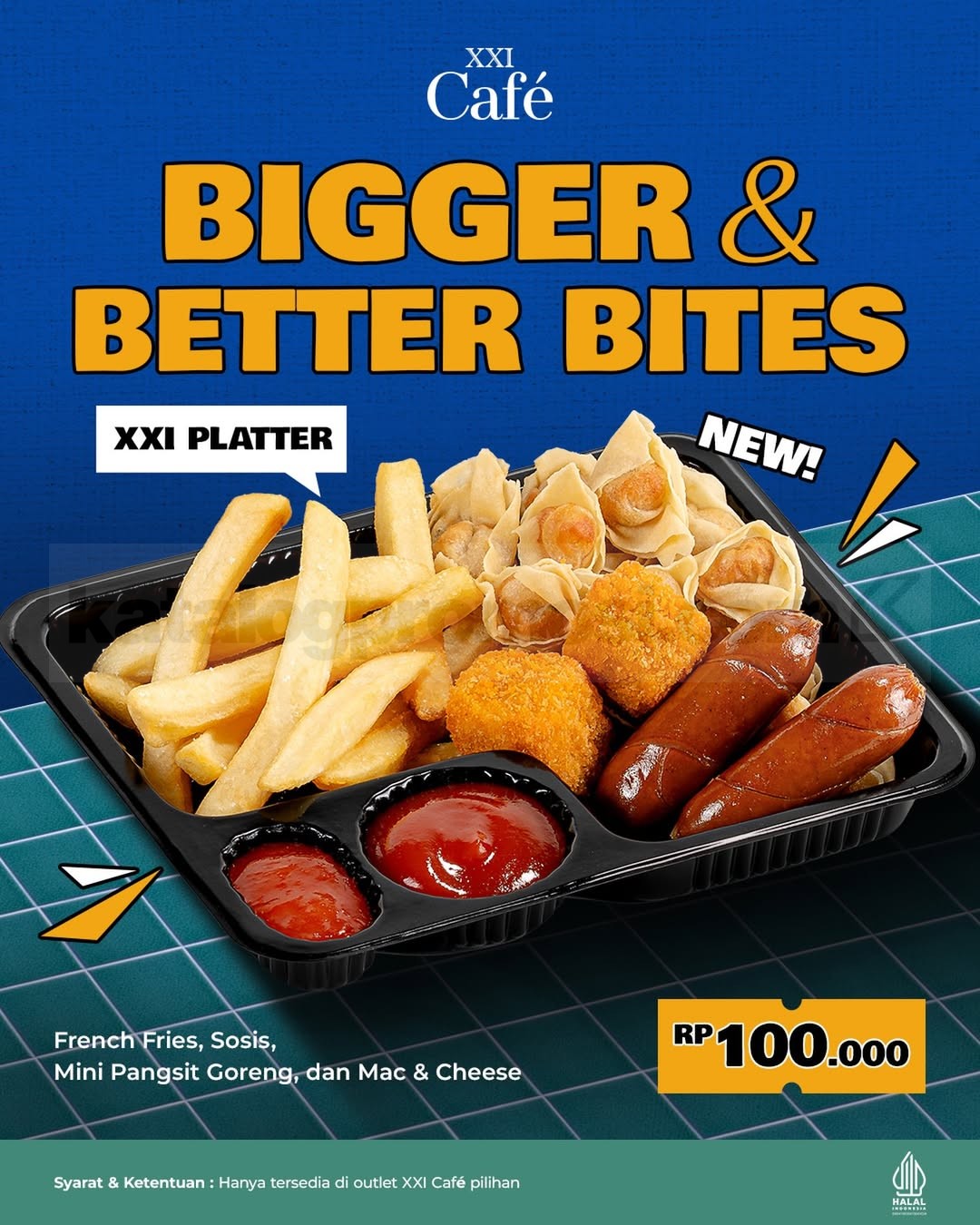 Promo XXI Cafe Bigger & Better Bites XXI Platter Rp.100.000 berisi aneka snack favorit untuk sharing berlaku selama persediaan masih ada di outlet pilihan