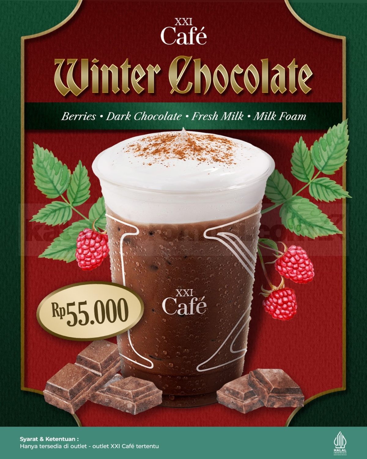 Promo berlaku untuk Winter Chocolate dengan harga 55Ribu di outlet XXI Café tertentu.