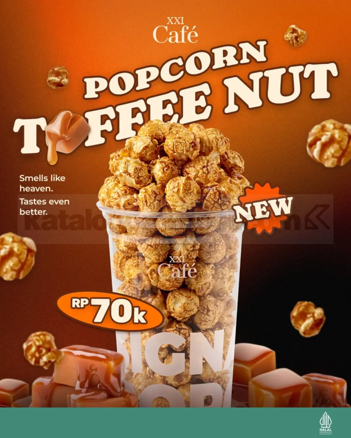 Calling out buat kamu para popcorn lover! 🔈 Ada yang baru nih dari XXI—kenalin, Popcorn Toffee Nut! 🎉 Perpaduan rasa toffee yang manis legit dan aroma kacang panggang yang wangi banget, bikin popcorn ini auto jadi menu jagoan baru buat nemenin nonton film kesayangan kamu 😍