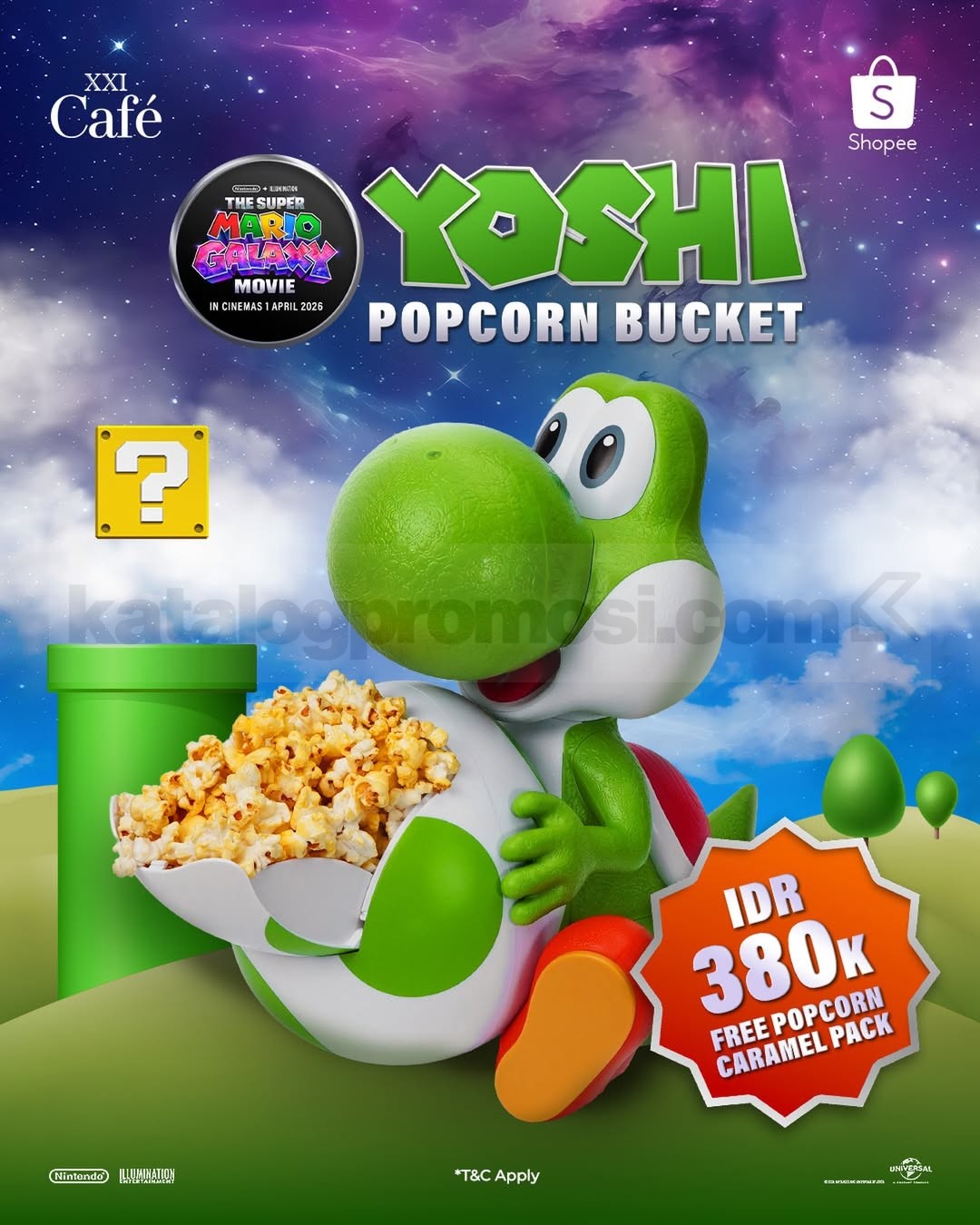 Promo berupa penjualan merchandise limited edition Yoshi Popcorn Bucket dari film The Super Mario Galaxy Movie.