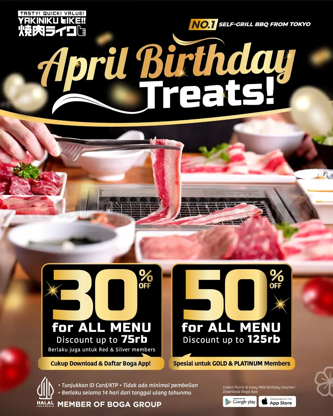 Promo Yakiniku Like April Birthday Treats diskon hingga 50% untuk member Boga App dengan ID berlaku mulai tanggal 1 April 2026 – 30 April 2026 di seluruh outlet