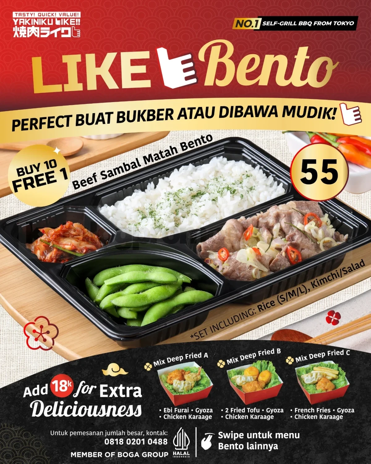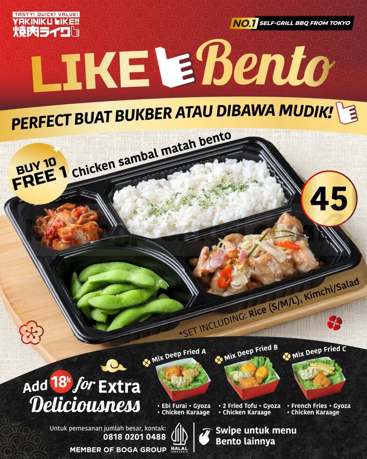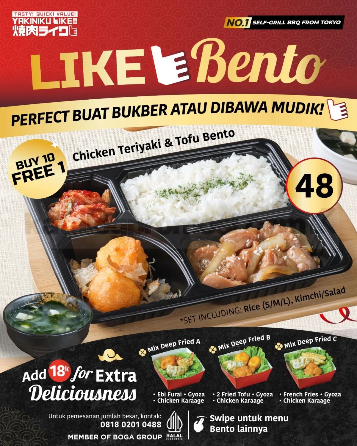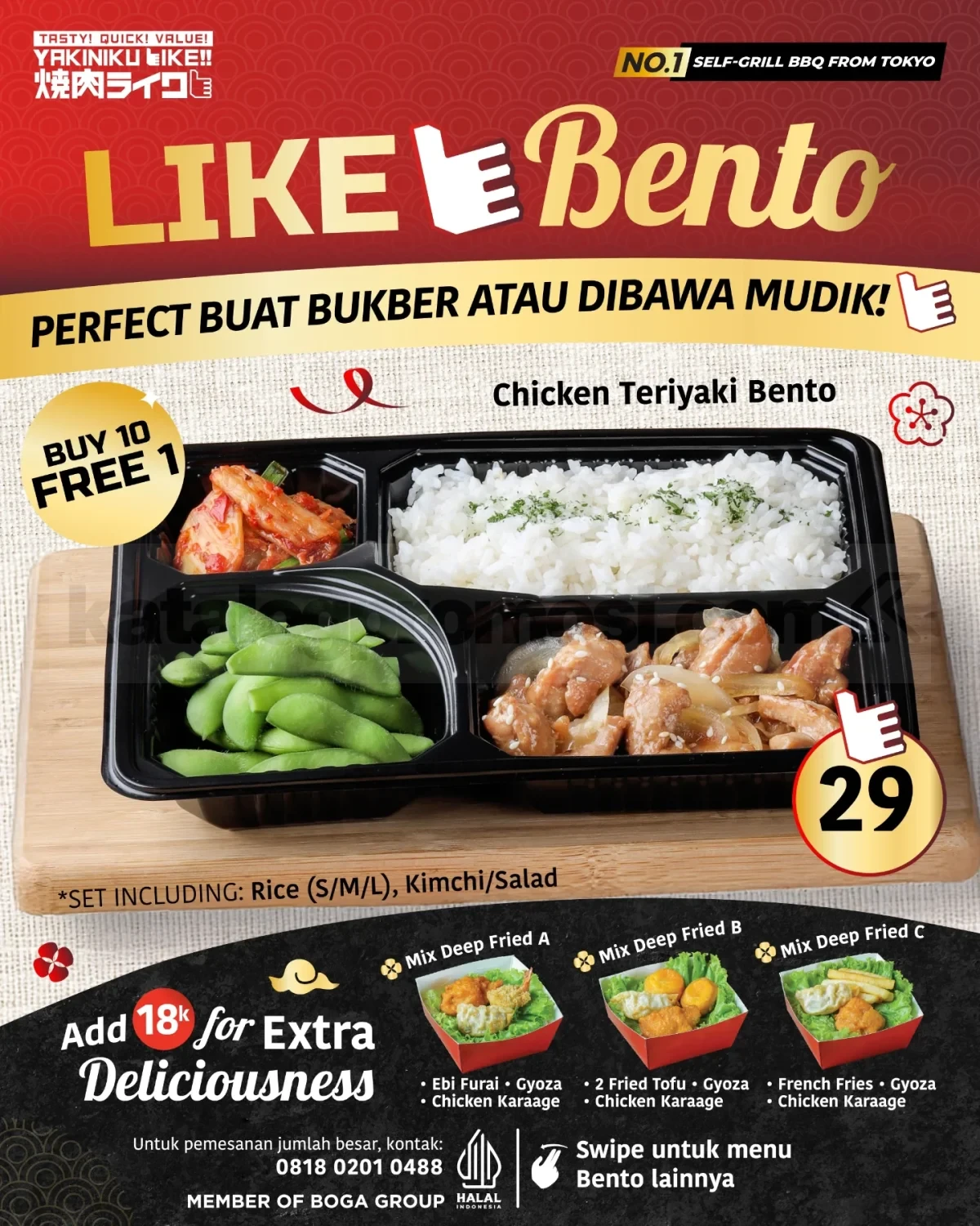 Dengan berbagai pilihan menu ayam dan daging sapi yang praktis, Promo Yakiniku Like Bento Buy 10 Free 1 mulai Rp. 29.000 bisa jadi solusi makan hemat untuk bukber bareng, sahur praktis, atau bekal perjalanan mudik. Pilih menu favoritmu dan pesan lewat WhatsApp supaya lebih mudah saat ingin order dalam jumlah banyak.