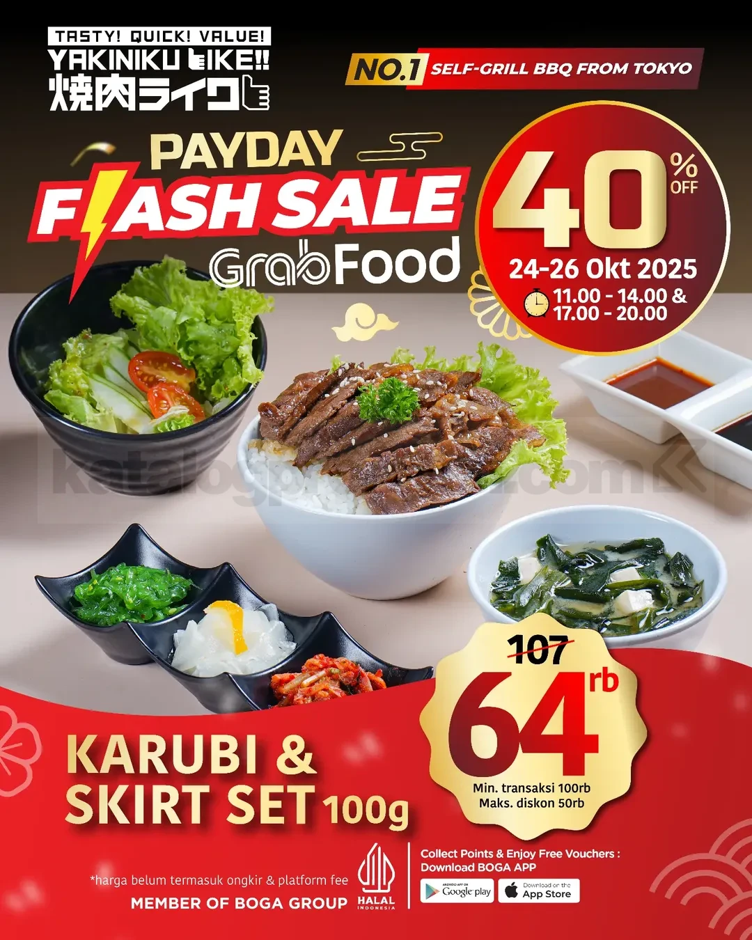 Promo Yakiniku Like GrabFood Flash Sale Diskon 40% buat Karubi & Skirt Set cuma Rp64rb! Berlaku 24β26 Oktober 2025 di jam tertentu.