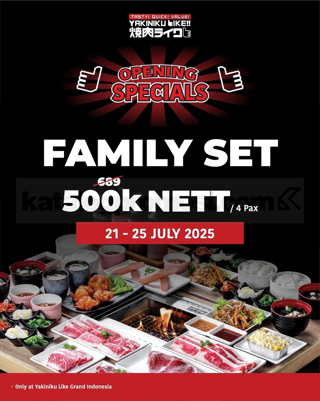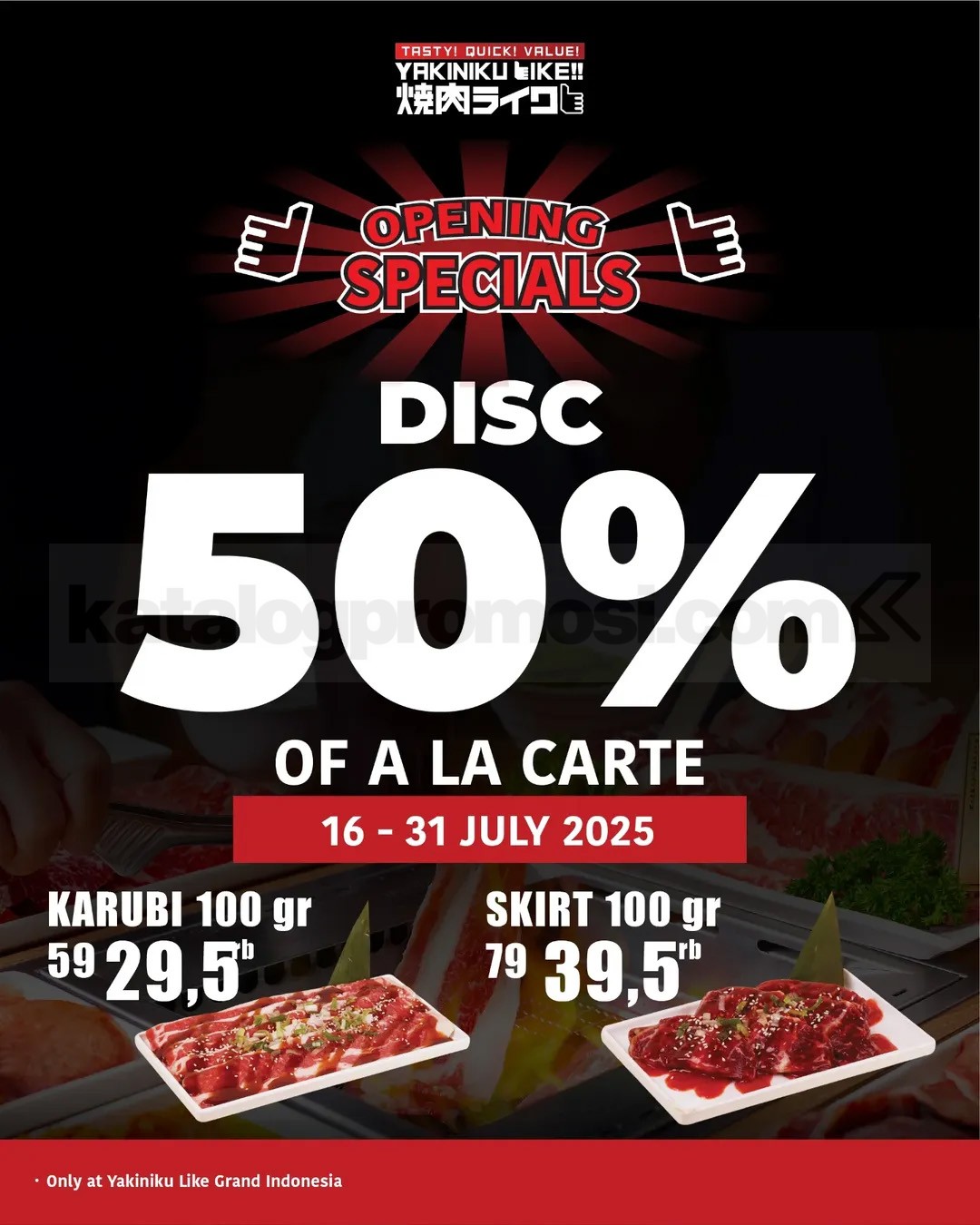 Berlaku di semua Yakiniku Like kecuali Pacific Place, Grand Indonesia, Mall of Indonesia, dan Trans Icon Surabaya.