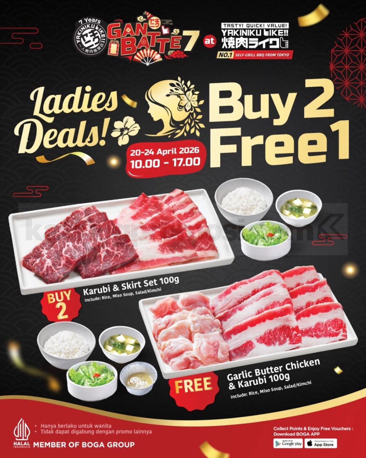 Pembelian dua Karubi & Skirt Set 100g mendapatkan satu Garlic Butter Chicken & Karubi 100g tanpa tambahan biaya dan setiap set sudah include Rice, Miso Soup, serta pilihan Salad atau Kimchi. Promo Yakiniku Like Hari Kartini Beli 2 Gratis 1 tersedia khusus untuk wanita pada tanggal 20 – 24 April 2026 pukul 10.00 – 17.00 di outlet Yakiniku Like.