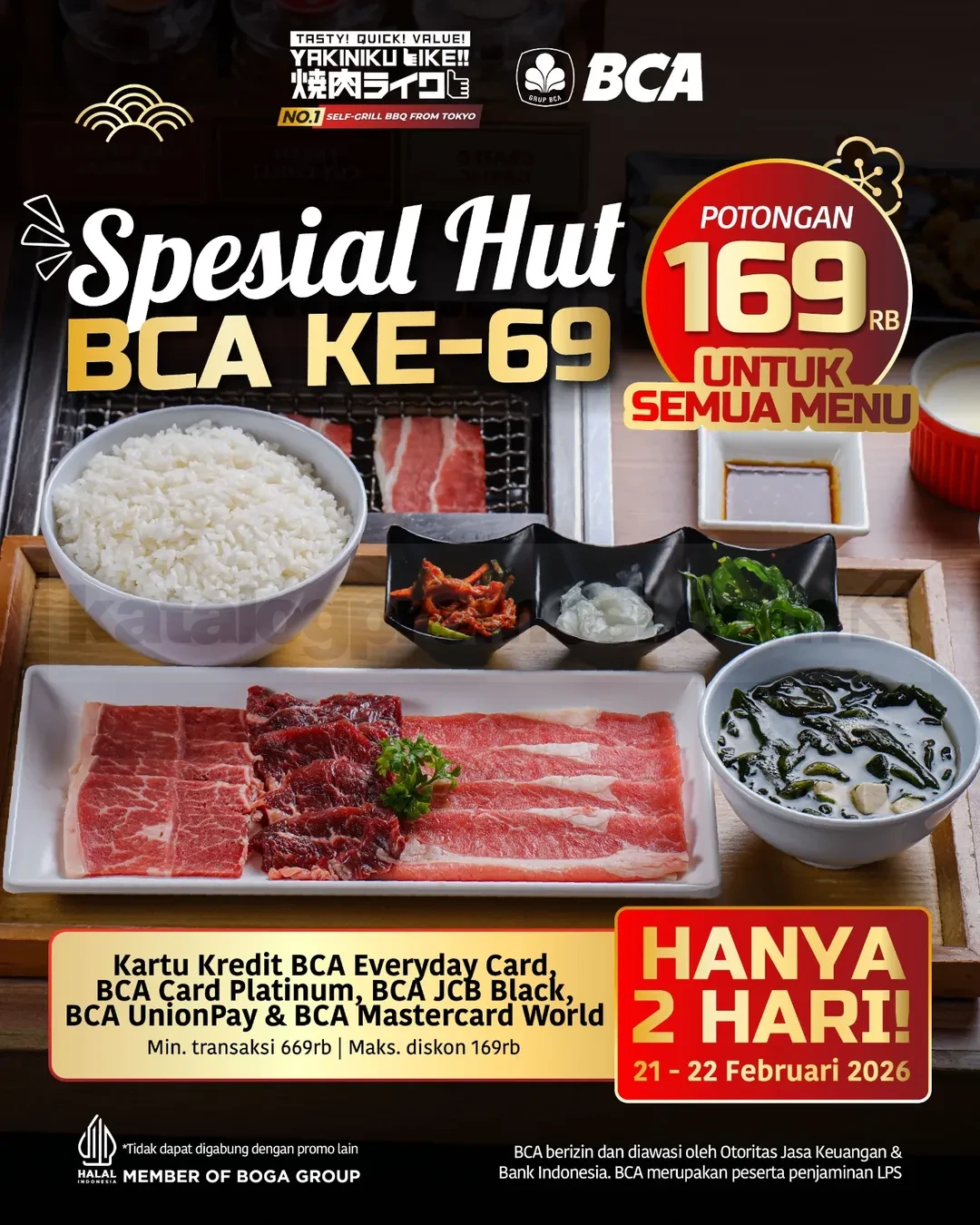 Promo Yakiniku Like HUT BCA Diskon Rp. 169ribu untuk min transaksi Rp. 669ribu dengan kartu kredit tertentu, berlaku mulai tanggal 21 Februari 2026 – 22 Februari 2026 di seluruh outlet.