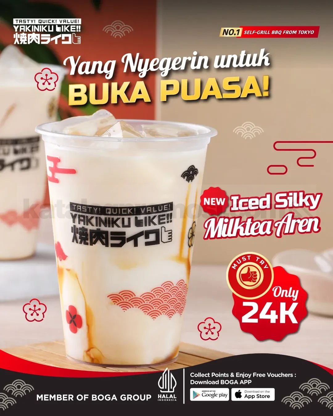 Nikmati Promo Yakiniku Like NEW! Iced Silky Milk Tea cuma Rp. 15 ribu ini untuk melengkapi momen berbuka puasa kamu dengan sensasi manis dan segar yang pas.