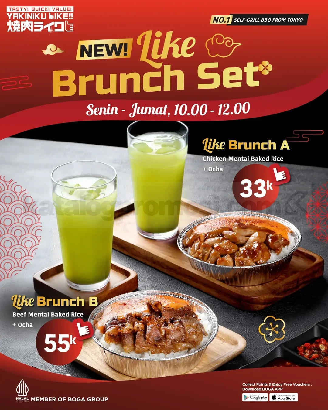 Promo Yakiniku Like New! Like Brunch Set mulai Rp. 33.000 dengan Chicken atau Beef Mentai Baked Rice + ocha, porsi pas dan mengenyangkan, berlaku Senin–Jumat pukul 10.00–12.00 di lokasi tertentu.