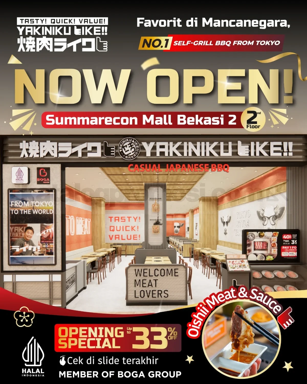Promo Yakiniku Like Opening Summarecon Mall Bekasi Diskon 33% berlaku di outlet baru lantai 2, opening special menu set lengkap dengan potongan harga pembukaan.