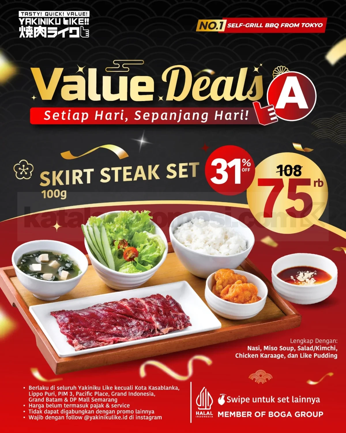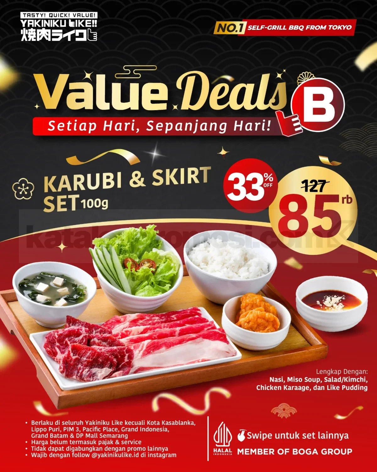 Promo Yakiniku Like Value Deals mulai Rp. 75.000 set lengkap diskon hingga 33% berlaku setiap hari di outlet Yakiniku Like tertentu.