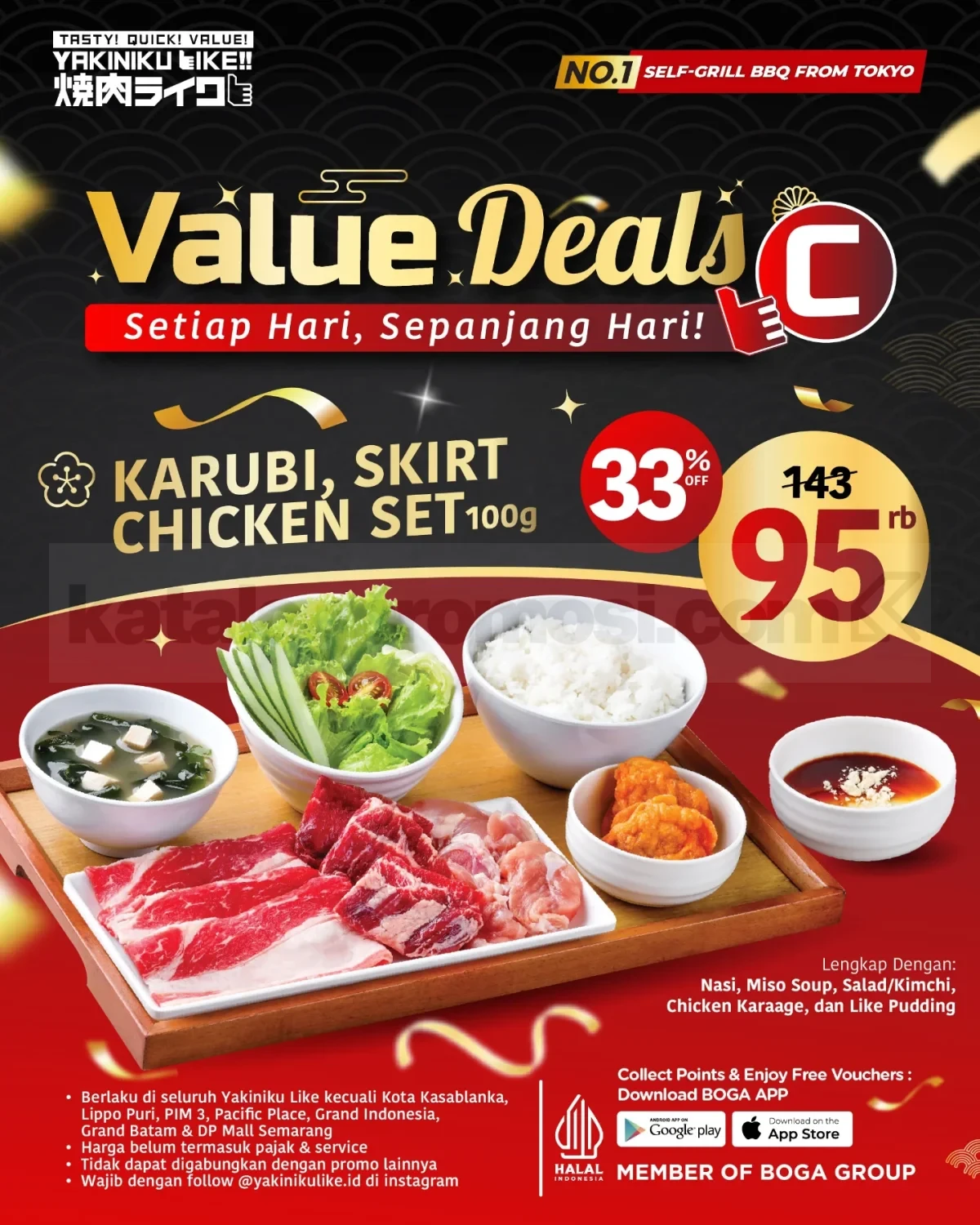 Kalau lagi pengin makan lengkap tanpa ribet dan tetap hemat, Value Deals Yakiniku Like ini tinggal dipilih sesuai selera dan langsung nikmati satu set penuh.