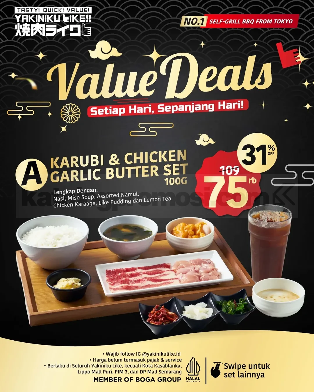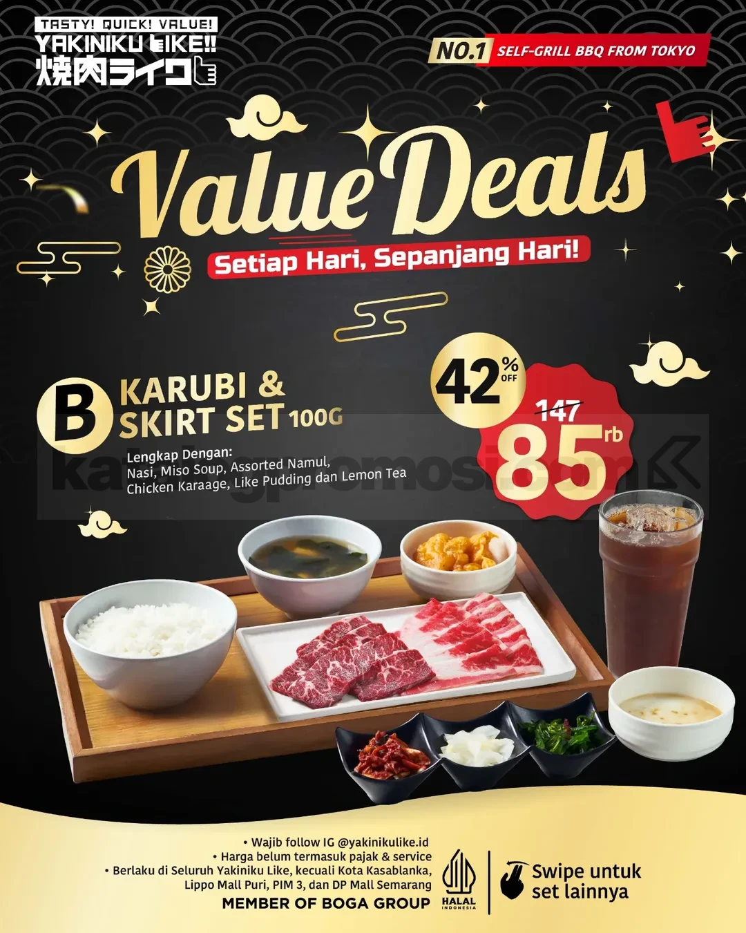 👉 Cek gambar promo Yakiniku Like Value Deals di bawah ini untuk lihat rangkuman menunya, pilihan paket, dan informasi lengkap yang mempermudah kamu memilih set favorit!