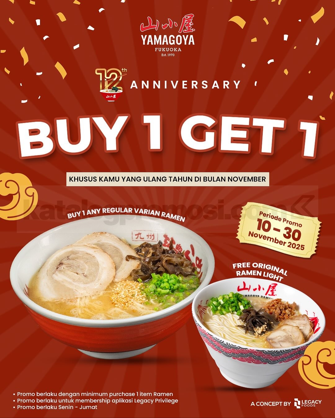 Promo YAMAGOYA RAMEN Anniversary Buy 1 Get 1 Free berlaku 10β30 November 2025 khusus member Legacy Privilege yang berulang tahun di bulan November.