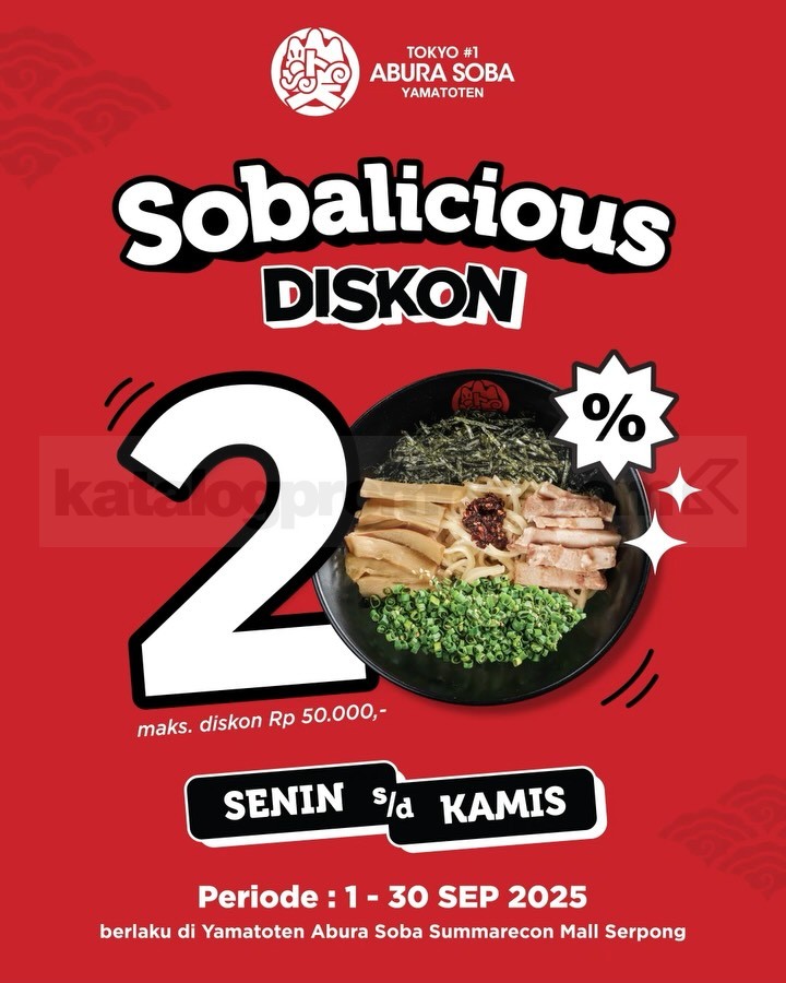 Promo Sobalicious kasih diskon 20% di Yamatoten Abura Soba Summarecon Mall Serpong. Berlaku Senin–Kamis hingga 30 September 2025.