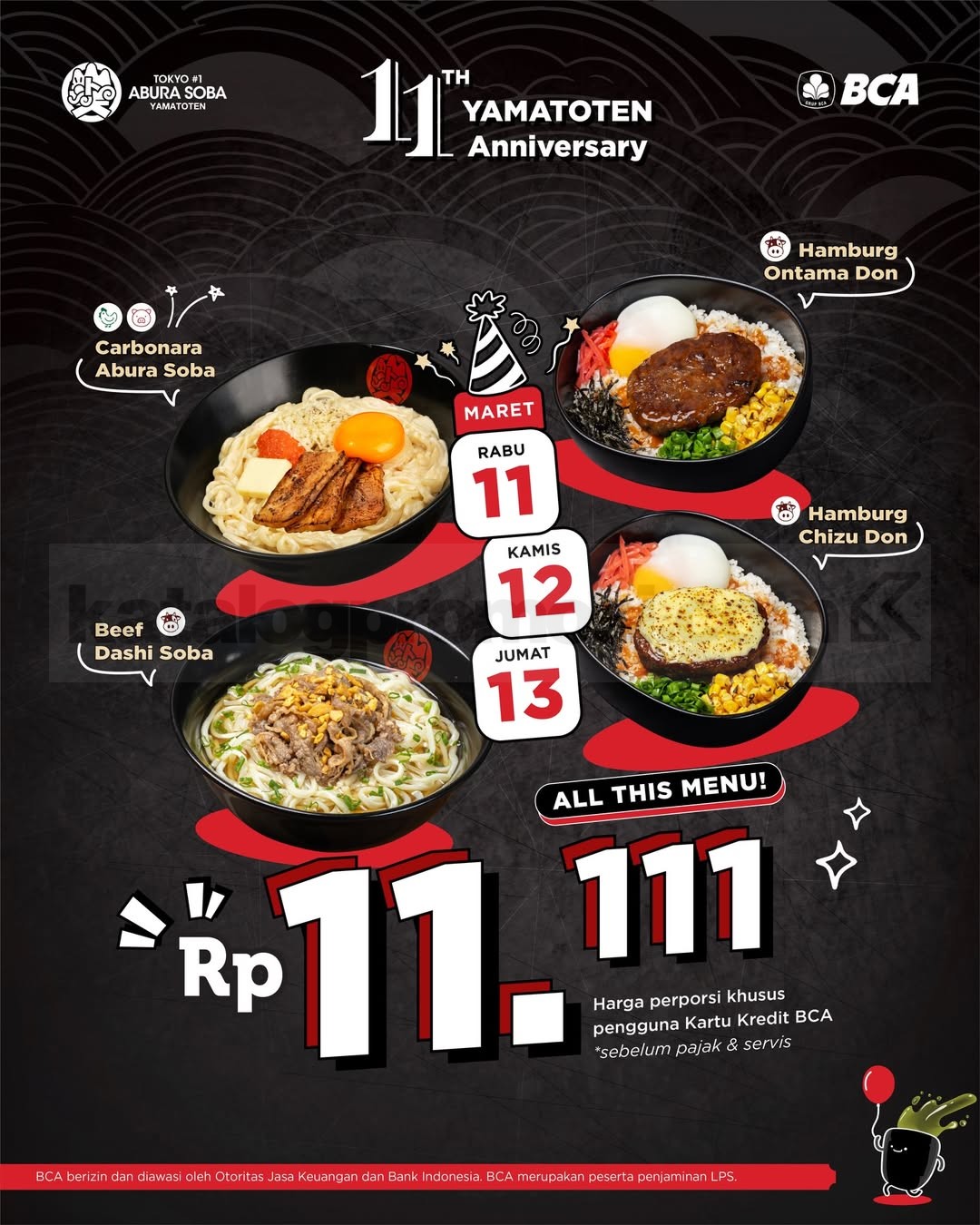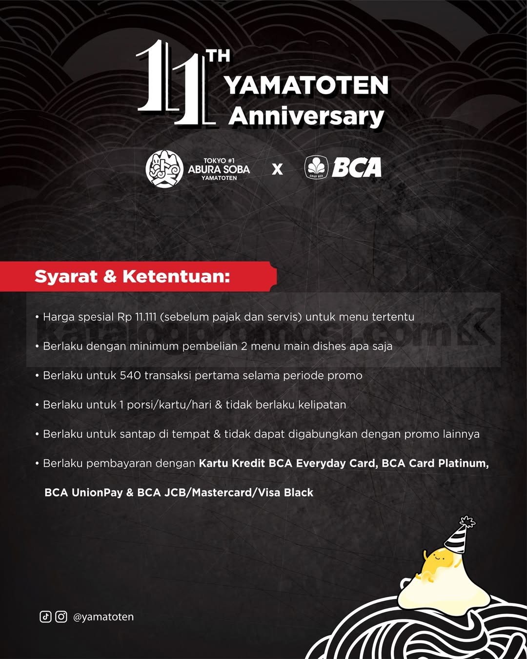 Promo Yamatoten Anniversary Menu mulai Rp. 11.111 untuk Beef Dashi Soba hingga Hamburg Don dengan kartu kredit BCA, berlaku mulai tanggal 11 Maret 2026 – 13 Maret 2026.
