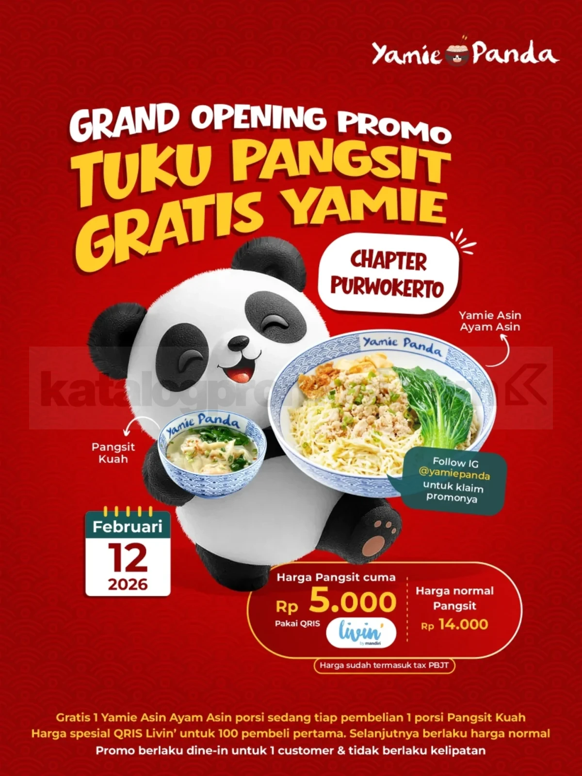 Promo Yamie Panda Grand Opening Gratis Yamie Asin Ayam Asin dengan pembelian pangsit kuah seharga Rp. 5.000 pakai QRIS Livin by Mandiri, berlaku mulai tanggal 12 Februari 2026 di Purwokerto.